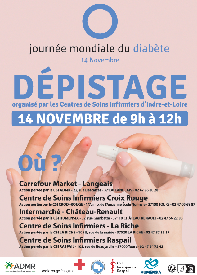 Dans le cadre de la journée mondiale du diabète , l’ensemble des Centres de Soins infirmiers d’Indre et Loire organisent une matinée de prévention et dépistage le 14 novembre prochain Ateliers, quizz et diverses animations seront présentés par les infirmières qui seront là pour répondre à toutes les questions sur le diabète. Vous trouverez ci-dessous l’ensemble…