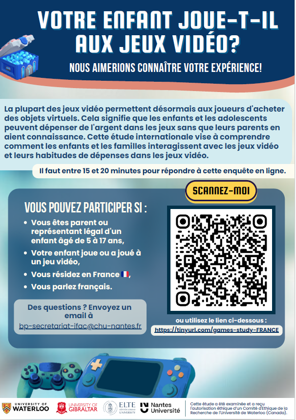 L’Institut fédératif des addictions comportementales du CHU de Nantes recherche des volontaires pour participer à une étude internationale sur les microtransactions dans les jeux vidéo. Si vous êtes parent ou représentant légal d’un enfant âgé de 5 à 17 ans, résidant en France, parlant français, et dont l’enfant joue ou a joué à un jeu…