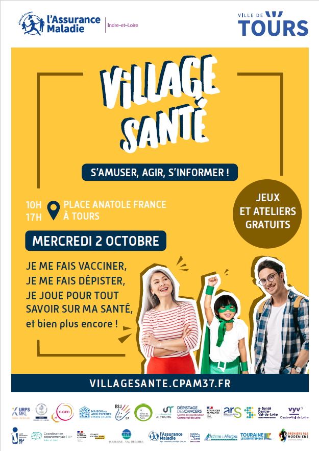 Manifestation le mercredi 2 octobre 2024 Place Anatole France pour sensibiliser les tourangeaux et tous ceux qu’ils le souhaitent aux principaux sujets de santé. Plus d’info : https://villagesante.cpam37.fr/