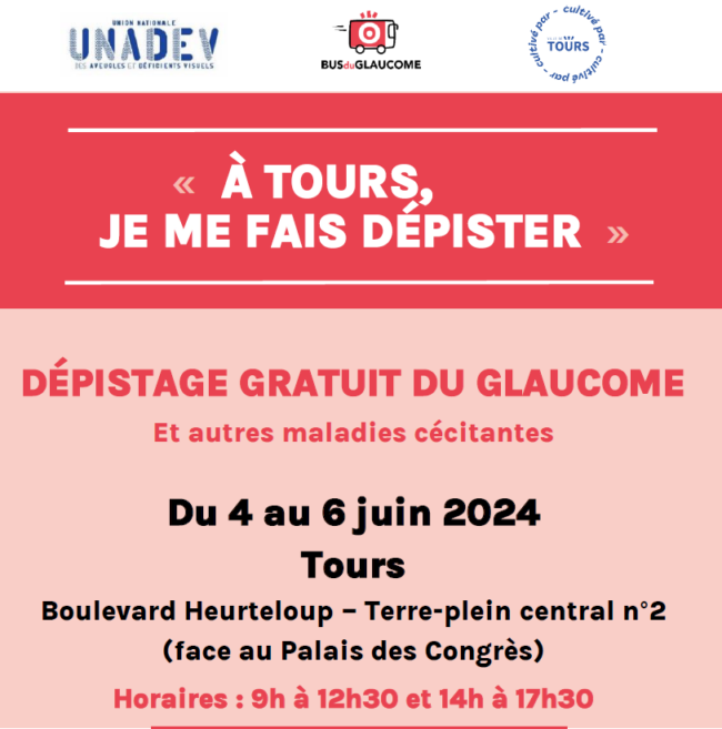 l’Union Nationale des Aveugles et Déficients Visuels (Unadev) organise une campagne de prévention et de dépistage du glaucome à Tours du 4 au 6 juin prochains Dans ce cadre, notre « Bus du Glaucome », une semi-remorque équipée de matériel ophtalmologique de pointe et d’un espace accueil, qui sillonne la France pour informer le public et permettre…