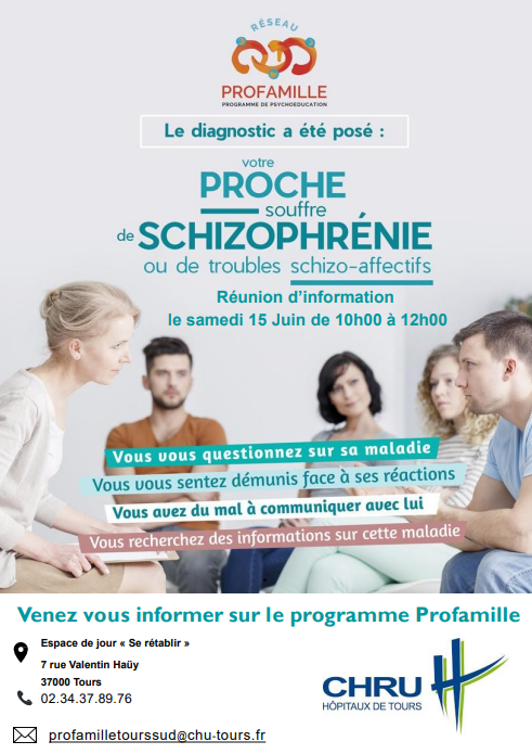 Le diagnostic a été posé : votre proche souffre de schizophrénie ou de troubles psycho affectifs : venez vous informez sur le programme pro famille. L’espace de jour « se rétablir » vous propose une réunion d’information dans le cadre du réseau pro famille samedi 15 juin de 10h à 12h dans ses locaux Renseignements : 02.34.37.89.76…
