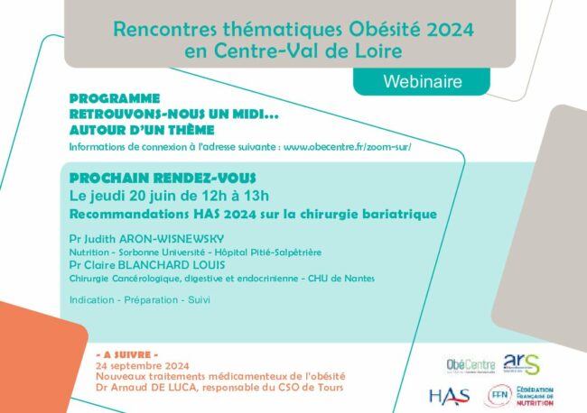 Le 20 juin 2024 à midi, le Pr Judith ARON-WISNEWSKY et le Pr Claire BLANCHARD LOUIS présenteront en webinaire Les recommandations de bonne pratique de la Haute Autorité de Santé parues le 28 Février 2024 : Prise en charge pré- et post-chirurgie bariatrique de l’adulte*. Seront abordés l’indication, la préparation et le suivi à la chirurgie de l’obésité.…