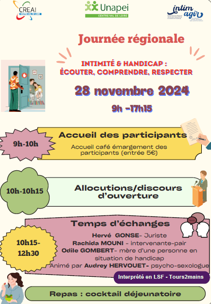 L’UNAPEI Centre Val de Loire, le Centre Ressource INTIMAGIR Centre Val de Loire et le CREAI Centre Val de Loire organisent une journée régionale le 28 novembre 2024 de 9h15 à 17h à l’Escale (37540 Saint Cyr Sur Loire) Cette journée ouverte à tous (personnes en situation de handicap, aidant.e.s, professionnel.le.s de l’accompagnement) se propose…