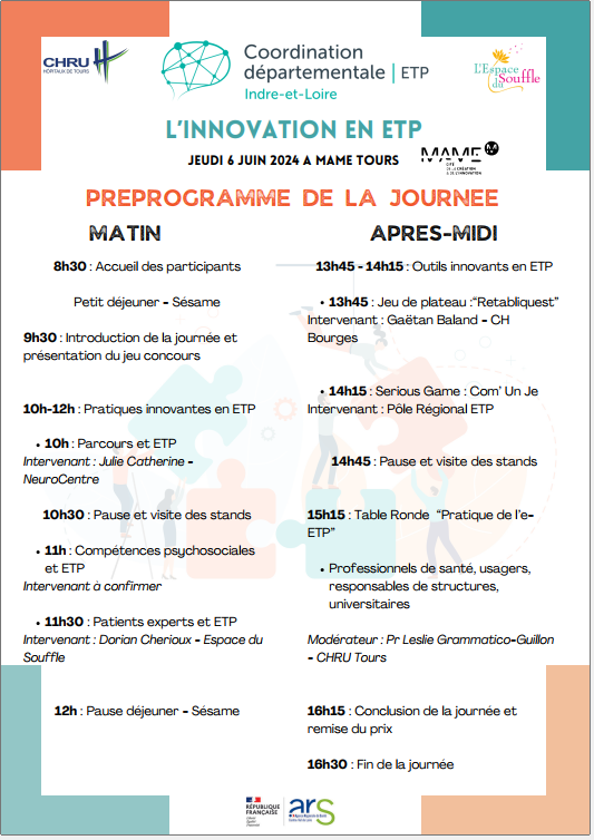 Le CHRU de Tours, la coordination départementale ETP et l’Espace du Souffle organise une Journée Départementale sur l’innovation en ETP. Elle aura lieu à MAME le Jeudi 6 Juin prochain. Lors de cette journée, la FRAPS aura le plaisir de tenir un espace ressources. Au programme : 8h30 : Accueil des participants Petit déjeuner –…
