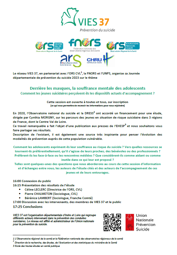 Le Réseau VIES 37, en partenariat avec l’ORS CVL1, la FNORS et l’UNPS, organise sa Journée départementale de prévention du suicide 2023 sur le thème Derrière les masques, la souffrance mentale des adolescents Comment les jeunes suicidaires perçoivent-ils les dispositifs actuels d’accompagnement? Inscription obligatoire. Contact Amandine CALTAGIRONE Secrétaire du Réseau VIES 37 pour la prévention…