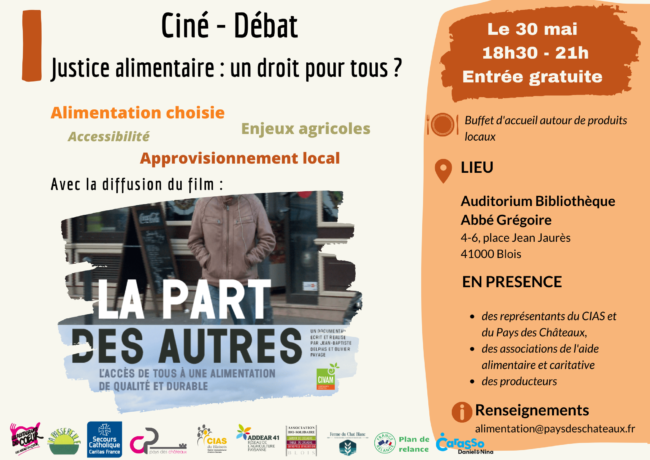 Les associations de l’aide alimentaire et caritative – Les Restos du Coeur, La Passerelle et le Secours Catholique – ainsi que le CIAS et le Pays des Châteaux, organisent un ciné-débat sur la « Justice Alimentaire : un droit pour tous ? » autour du film « La part des autres« . Ainsi, nous avons le plaisir de vous inviter à cette…
