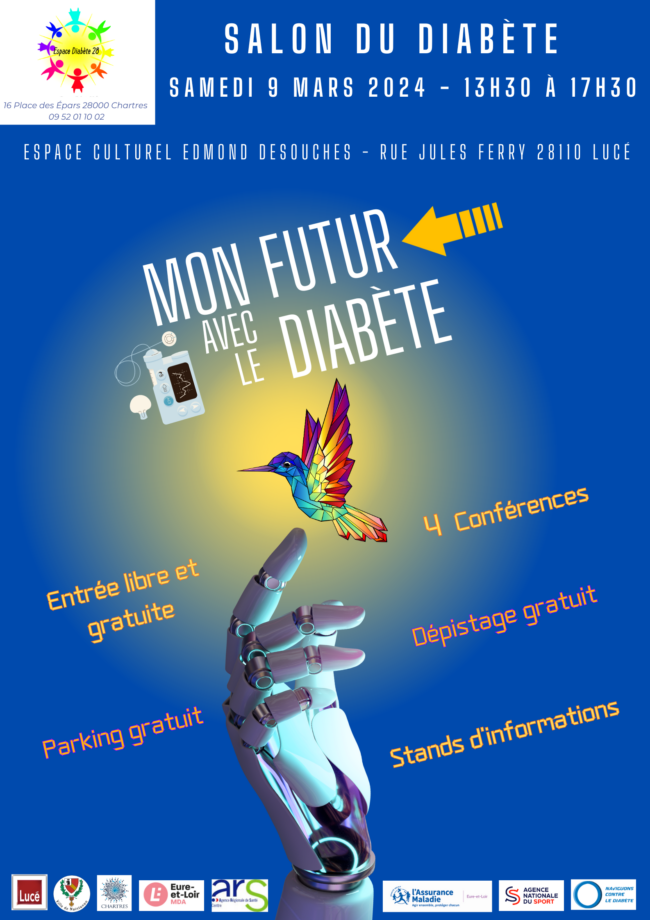 La prochaine édition du Salon du Diabète se tiendra le Samedi 9 Mars 2024 de 13h30 à 17h au Centre culturel Edmond Desouches à Lucé sur le thème « Mon futur avec le Diabète« . Conférences et stands d’information Quatre conférences sont organisées l’après-midi : 14h: Mme Rouziès – Diététicienne : » La Malbouffe « 15h: Dr…