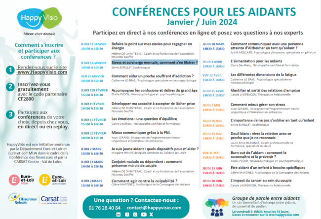 Découvrez le programme des conférences et ateliers en ligne HAPPY VISIO ouverts à tous et à destination des seniors et des proches aidants. Ces actions bénéficient du soutien de la Maison de l’Autonomie (MDA) et du Conseil Départemental d’Eure-et-Loir dans le cadre de la conférence des financeurs. Programme des conférences en ligne à destination…