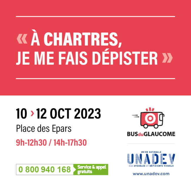 A l’occasion de la Journée Mondiale de la Vue et en partenariat avec les Opticiens Mobiles, la Mairie de Chartres et Chartres Métropoles, l’Union Nationale des Aveugles et Déficients Visuels (Unadev) invite le grand public à venir réaliser un dépistage gratuit des pathologies cécitantes comme le glaucome, Place des Epars, du 10 au 12 octobre…