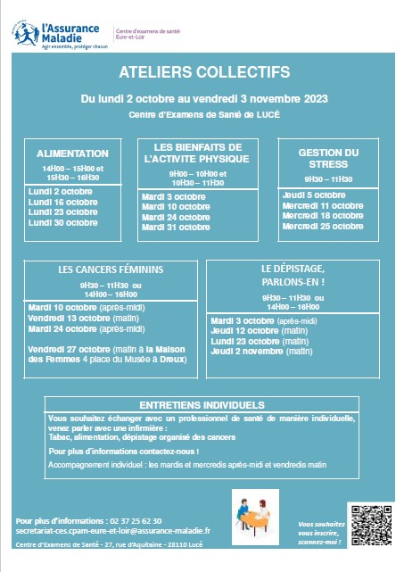 Le Centre d’Examens de Santé de Lucé propose au mois d’octobre des séances collectives d’éducation en santé animées par ses infirmières. Programme des ateliers collectifs Téléchargez le programme des ateliers Atelier « alimentation » Il s’agit d’un atelier participatif qui permet d’acquérir des compétences pour faire des choix bénéfiques en matière d’alimentation. Les participants pourront notamment bénéficier…