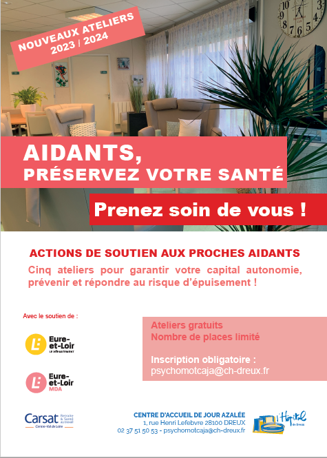 Le Centre d’accueil de jour Azalée de Dreux propose 5 ateliers gratuits pour prendre soin des aidants. Ces ateliers sont ouverts à tous les aidants suivis ou non par le centre. Ils visent à garantir le capital autonomie, prévenir et répondre au risque d’épuisement des aidants. Flyer à télécharger Inscription et informations pratiques Ateliers gratuits…