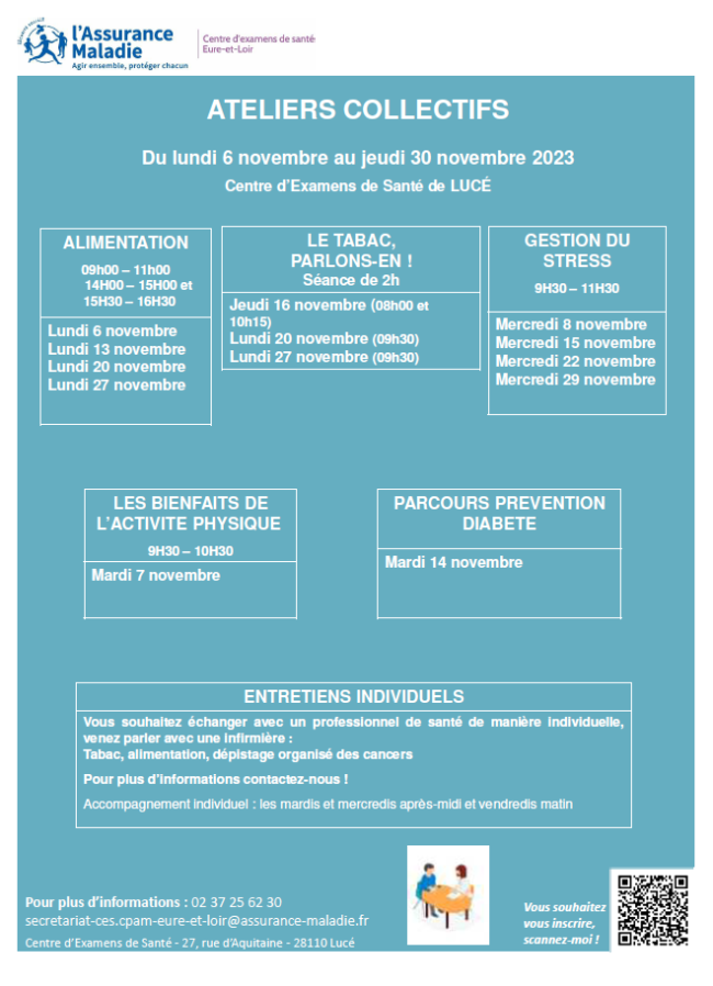 Le Centre d’Examens de Santé de Lucé propose du 6 au 30 novembre 2023 des séances collectives d’éducation en santé animées par les infirmières du Centre. Programme des ateliers collectifs Téléchargez le programme des ateliers – Ateliers « LE TABAC, parlons-en ! » à l’occasion du Mois sans Tabac : ateliers collectifs permettant de faire…