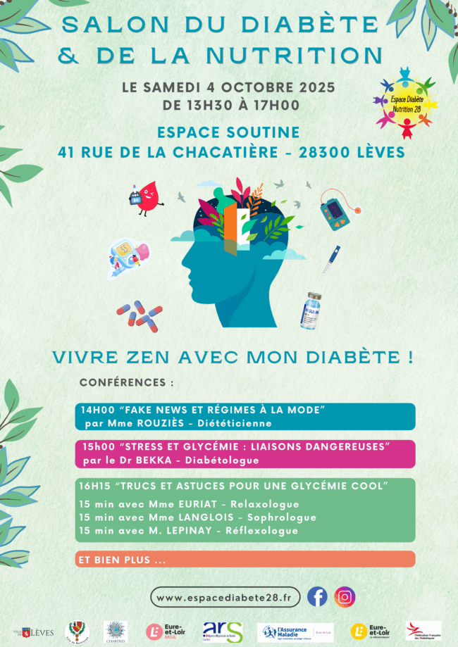 Le Salon du Diabète et de la Nutrition le Samedi 4 octobre de 13h30 à 17h00 Le Thème de cette année : » Vivre Zen avec mon diabète ! » Entrée et parking Gratuits Nouveau Lieu : Espace Soutine – 41 rue de la Chacatière 28300 Lèves. PROGRAMME des Conférences 14h00 : Mme Émilie Rouziès…
