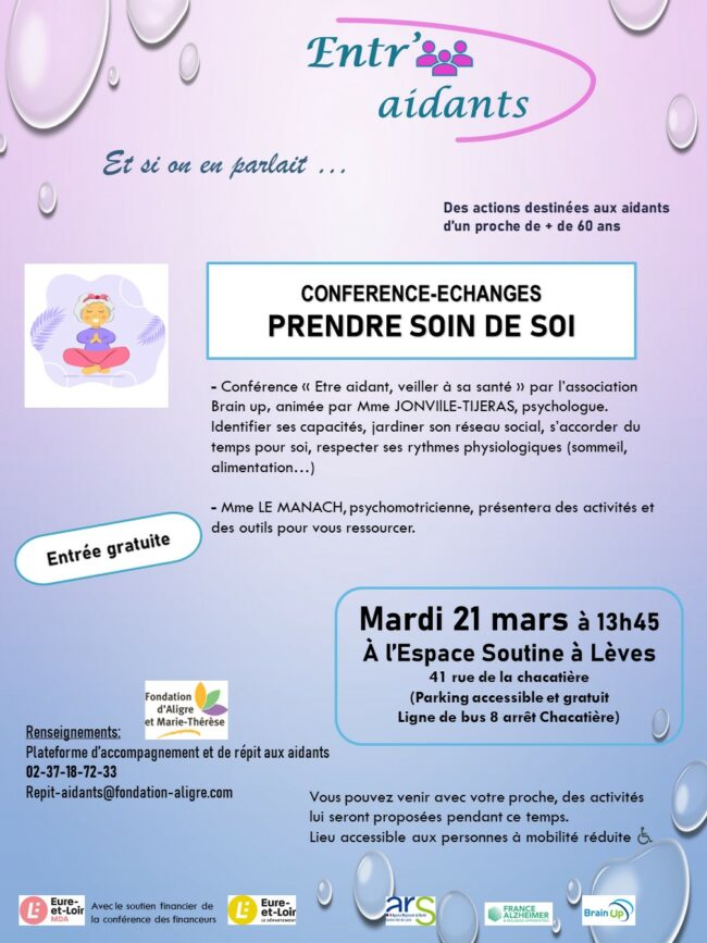 La Fondation d’Aligre organise le 21 mars à 13h45 une conférence pour prendre soin de soi à destination des aidants. La conférence « Être aidant, veiller à sa santé » est organisée par l’association Brain up et animée par Mme JONVIlLE-TIJERAS, psychologue. Au programme : – Identifier ses capacités, jardiner son réseau social, s’accorder…
