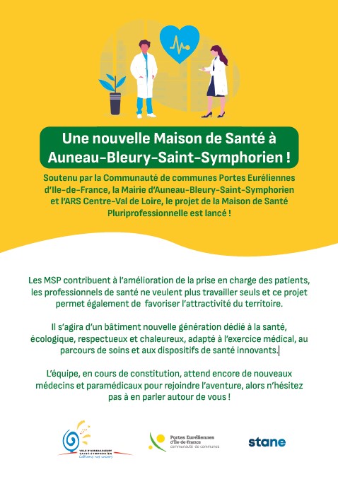 Soutenu par la Communauté de communes Portes Euréliennes d’Ile-de-France, la Mairie d’Auneau-Bleury-Saint-Symphorien et l’ARS Centre-Val de Loire, le projet de la Maison de Santé Pluriprofessionnelle est lancé ! L’équipe, en cours de constitution, est à la recherche de professionnels de santé. Il s’agira d’un bâtiment nouvelle génération dédié à la santé, écologique, respectueux et chaleureux,…