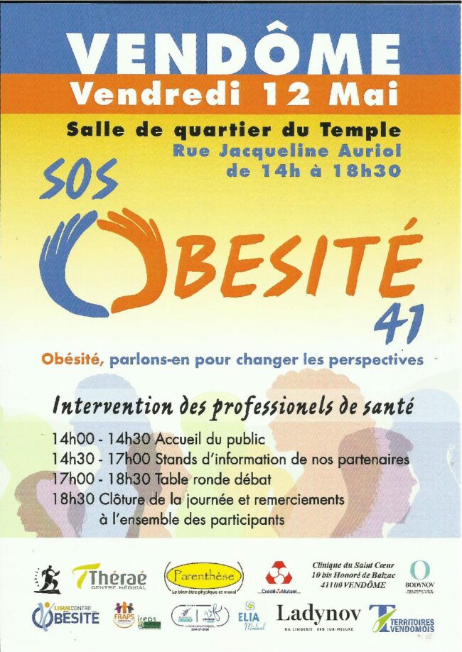 FORUM organisé par SOS OBESITE 41 Vendredi 12 mai 2023 de 14h à 18h30 Salle de quartier du temple – rue Jacqueline Auriol – 41100 VENDOME Programme : affiche A4 JVO.2023_