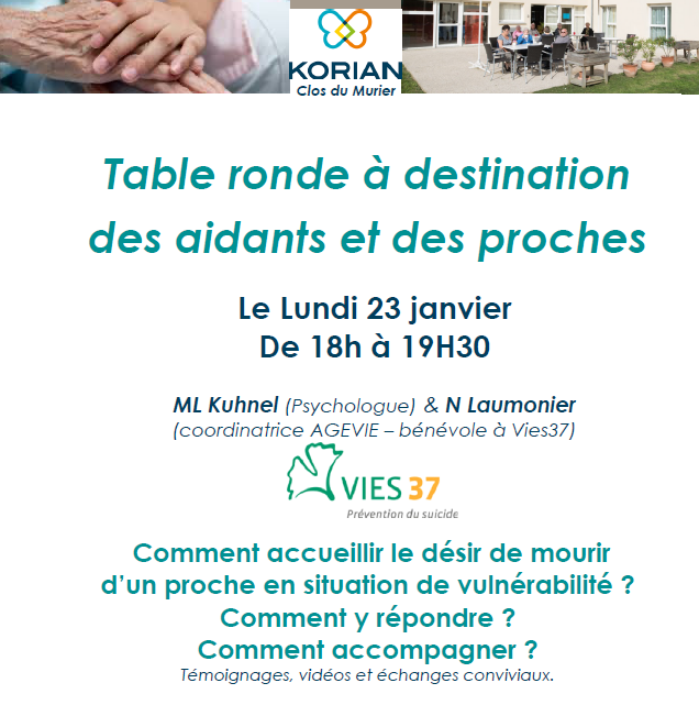 Comment accueillir le désir de mourir d’un proche en situation de vulnérabilité ? Comment y répondre ? Comment accompagner ? Table ronde à destination des aidants et des proches Le Lundi 23 janvier De 18h à 19H30 animée par ML Kuhnel (Psychologue) & N Laumonier (coordinatrice AGEVIE – bénévole à Vies37) Témoignages, vidéos et échanges…