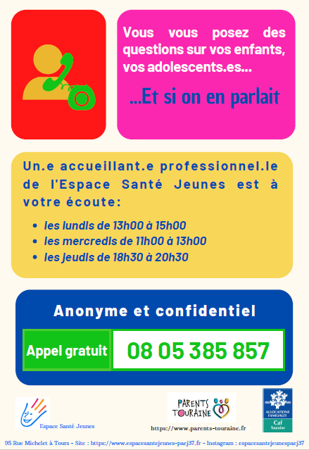 Mise en place par l’Espace Santé Jeunes, cette ligne d’écoute s’adresse aux parents d’enfants et de jeunes entre 6 et 25 ans. Des professionnels sont à l’écoute 3 fois par semaine le lundi de 13h à 15h, le mercredi de 11h à 13h et le jeudi de 18h30 à 20h30. Anonyme et confidentiel : Appel…