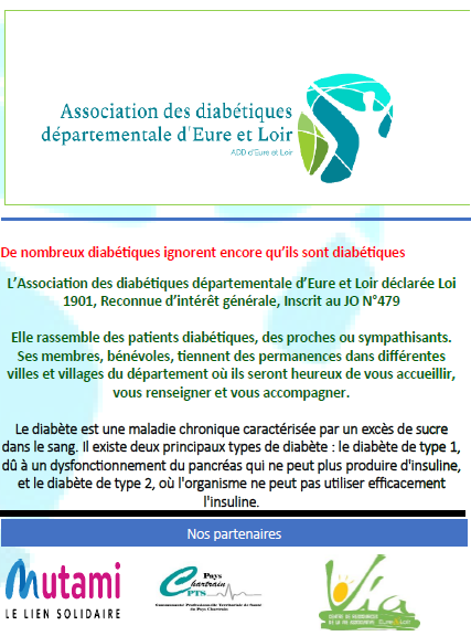 L’ Association des Diabétiques Départementale d’Eure-et-Loir, vient d’être créée, elle à pour objectif de créer du lien social, pour les personnes atteintes de diabète, de faire comprendre les complications liées à la pathologie, d’être à leurs écoutes, par des groupes de rencontre, des évènements, forums, stand d’information de sensibilisation et de prévention sur le département.…