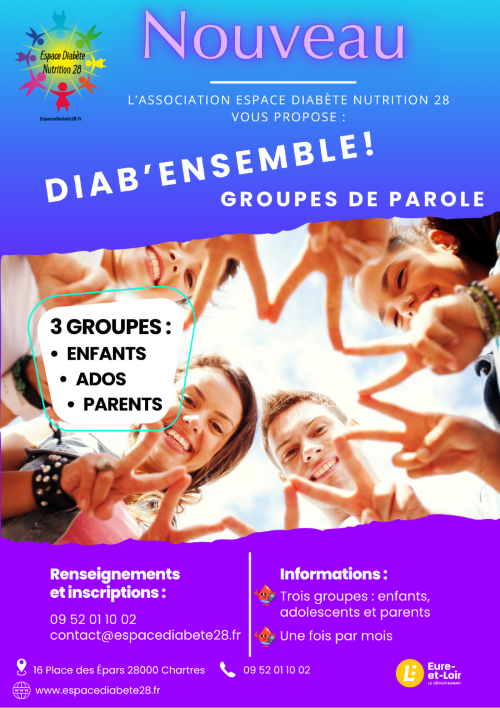 L’association Espace Diabète Nutrition 28 propose 3 groupes de parole réservés aux enfants, adolescents atteints de diabète de type1 et leurs parents, une fois par mois. Ce sont des sessions de 5 mois menées par un psychologue et un patient expert. Renseignements et inscriptions Tél : 09.52.01.10.02 Mail : contact@espacediabe28.fr