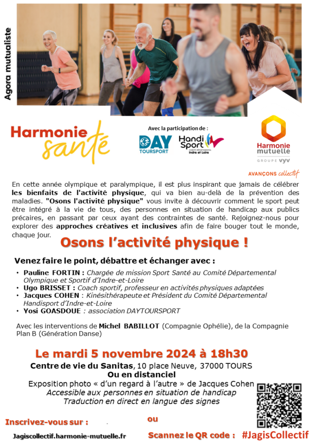 « Osons l’activité physique » vous invite à découvrir comment le sport peut être intégré à la vie de tous le mardi 5 novembre 2024 à 18h30 au Centre de vie du Sanitas : 10 place Neuve, 37000 Tours (ou en distanciel). Pour vous inscrire, scannez le QR code ci-dessous ou rendez-vous sur jagiscollectif.harmonie-mutuelle.fr