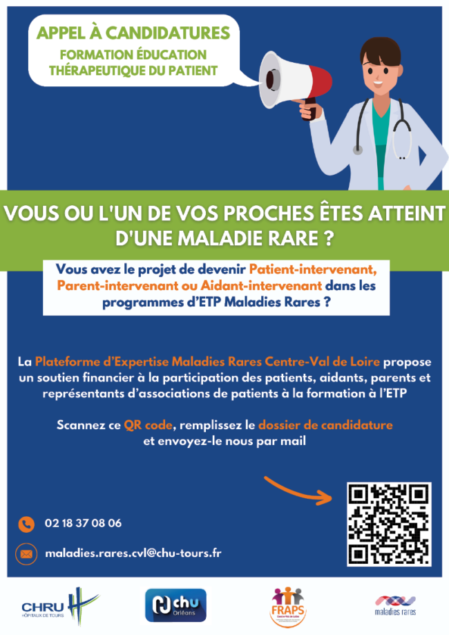 LA PLATEFORME REGIONALE MALADIES RARES LANCE SON APPEL À CANDIDATURES « Devenez Patient-Intervenant/Parent-Intervenant/Aidant-Intervenant dans les programmes d’Education Thérapeutique du Patient Maladies Rares » Vous avez le projet de devenir Patient-intervenant, Parent-intervenant ou Aidant-intervenant dans les programmes d’ETP Maladies Rares ? La Plateforme d’Expertise Maladies Rares Centre-Val de Loire propose un soutien financier à la participation…