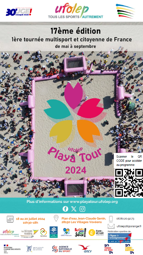 L’UFOLEP en partenariat avec la mairie des Villages Vovéens et la Communauté de Communes Coeur de Beauce organise le Playa Tour 2024 au Plan d’Eau des Villages Vovéens les 18,19 et 20 juillet 2024. Programme Consultez le programme Entrée libre et gratuite Tél : 06.80.20.92.73 ufolep28@orange.fr