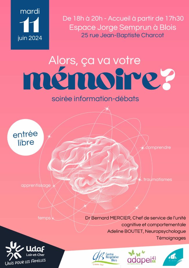 L’Union Départementale des Associations Familiales de Loir-et-Cher vous invite à sa prochaine Soirée d’Information sur le thème de la mémoire qui se déroulera : Le mardi 11 juin 2024 à 18h (accueil à partir de 17h30- Entrée libre) à l’Espace Jorge Semprun situé au 25 rue Jean-Baptiste Charcot à Blois. Cette rencontre sera animée par :…