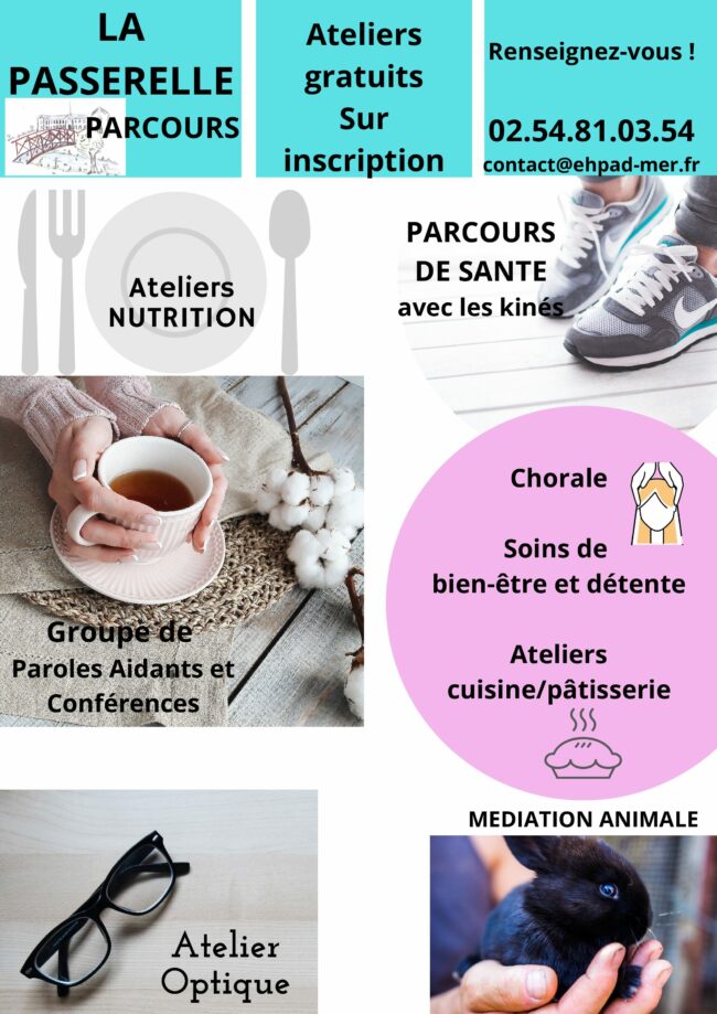 Le service « La Passerelle-PARCOURS » présente son programme 2021 ! Parcours de Santé Affiche La Passerelle PARCOURS 2021 Médiation animale Groupes de Paroles Aidants Affiche Groupe de paroles aidants 2021 Ateliers Optique Optique Forêt 12 08 2021 Ateliers Nutrition Ateliers Nutritions flyers 2021 Chorale, Ateliers pâtisserie, Ateliers Gestes et Postures, Ateliers Bien-être et Détente Conférence 2021 …